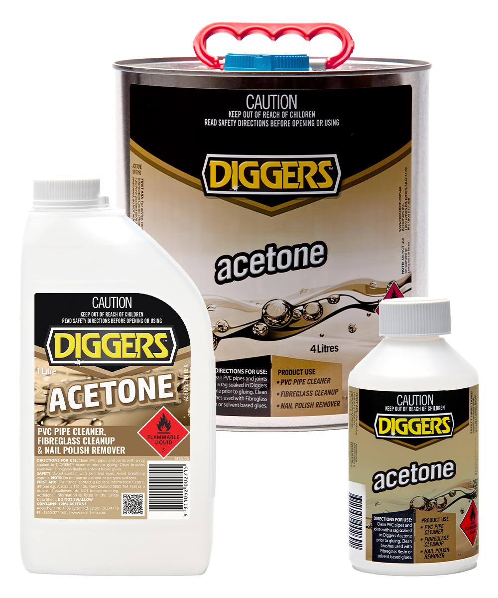 NOTE: Always test a small area first as DIGGERS™ Acetone is a very strong solvent that may damage some plastics and other materials. DO NOT use on painted or perspex surfaces.