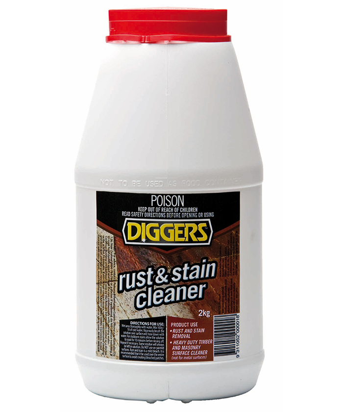 Diggers Rust and Stain Cleaner is a naturally occurring biodegradable organic product which effectively removes stains and cement residue. It is a mild bleaching agent that also rejuvenates tired looking timber.